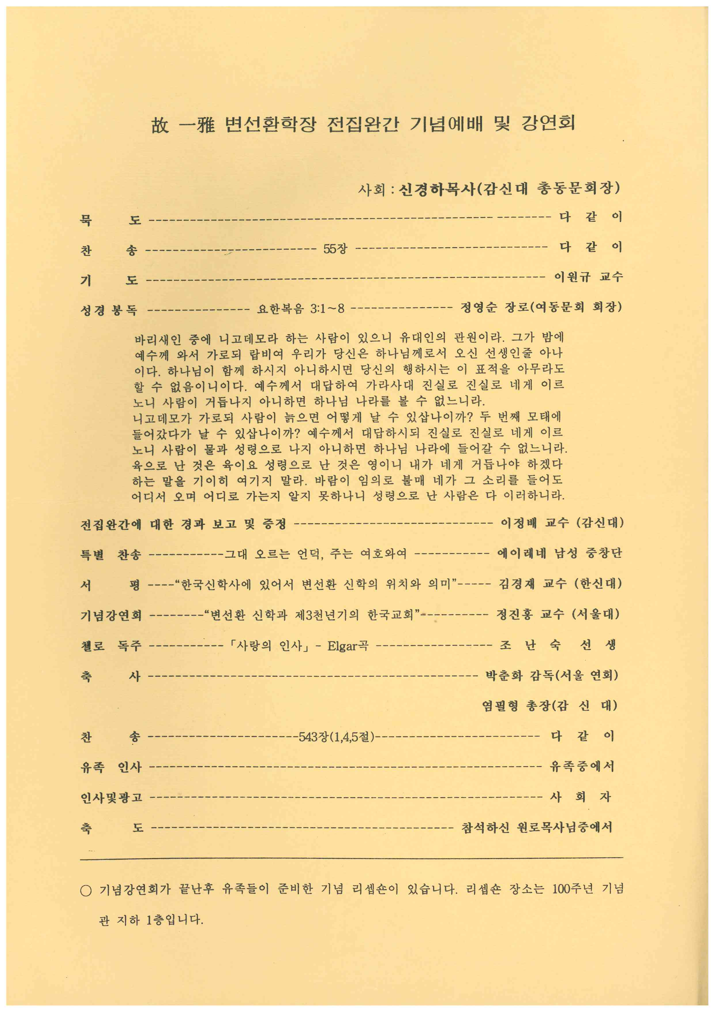 1999년 5월 3일 월요일 15시에 일아 변선환 전집 완간 기념예배 및 강연회가 있었다.