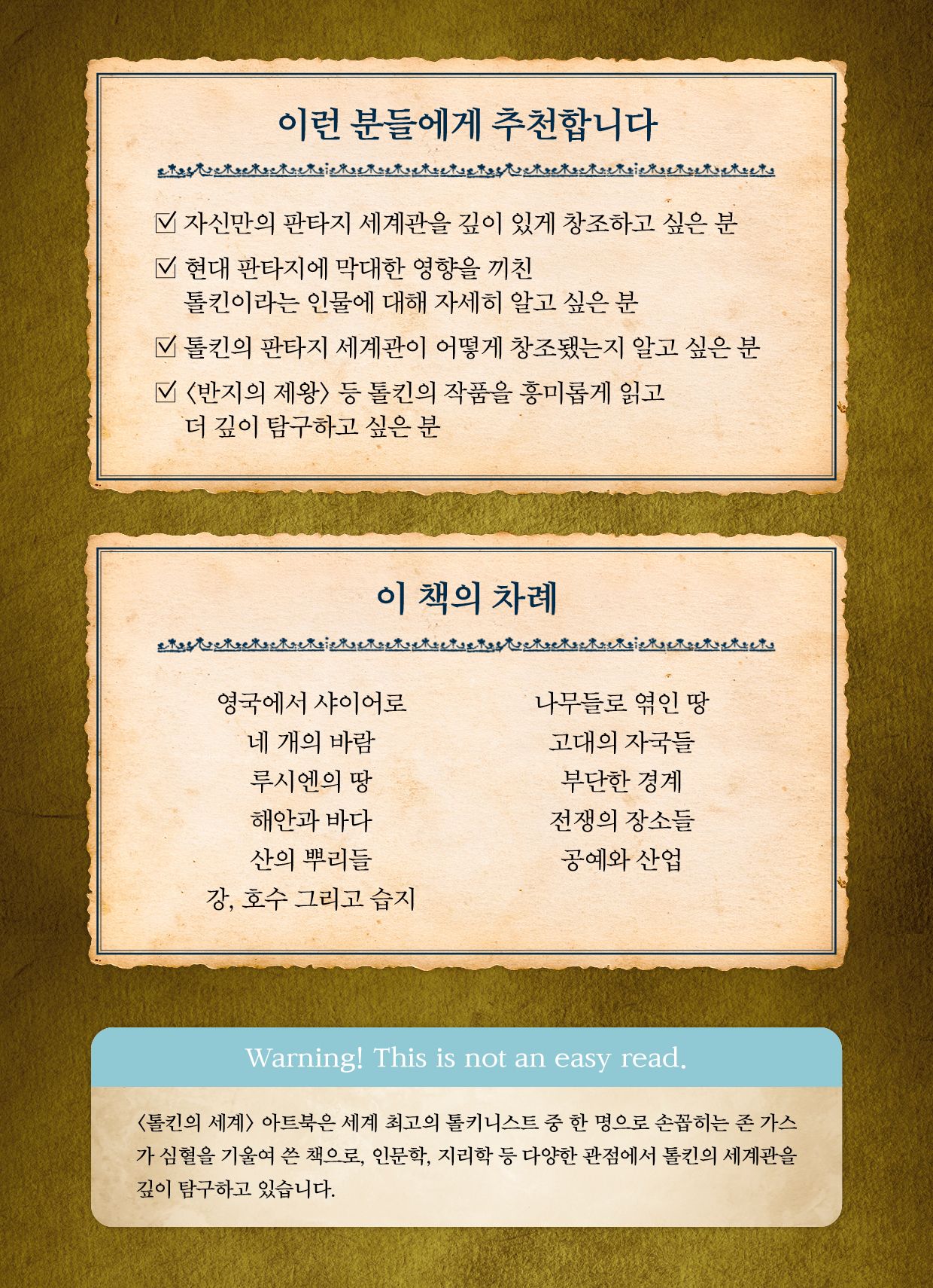 본문의 글자 크기는 작은 편입니다. 글자 크기가 독서에 중요하신 분들은 서점에서 직접 확인하시고 구입하시기를 권면합니다. 책의 내용은 톨킨을 탐구하는 데 도움이 됩니다.